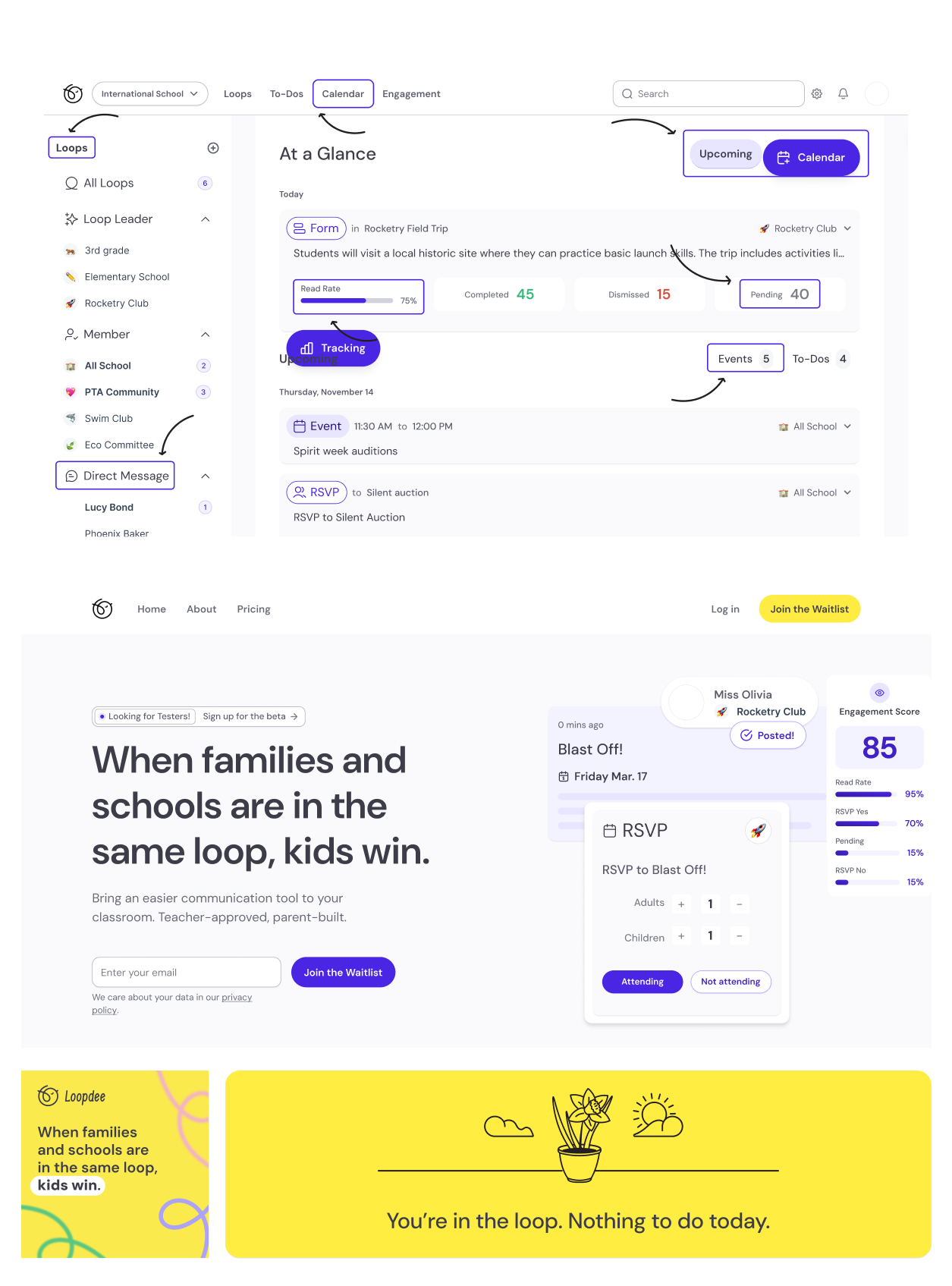 We developed Loopdee. An all-in-one platform that simplifies how busy teachers and busy parents send and receive information. AI-integrations clarify and shorten messages, calendar events are automatically added, and sign-ups and RSVPs are a breeze.